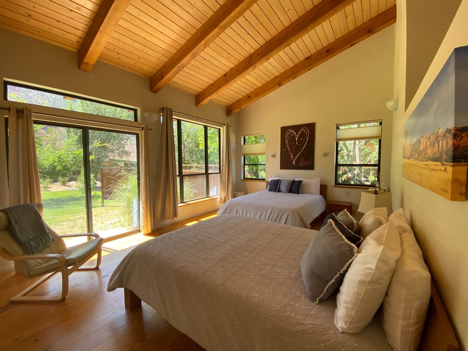 This primary bedroom includes two queen beds with a private bath in the stunning Nama-Stay House. A shared courtyard and outdoor patio, fully equipped kitchen, and large common areas with Zion Canyon mountain views.